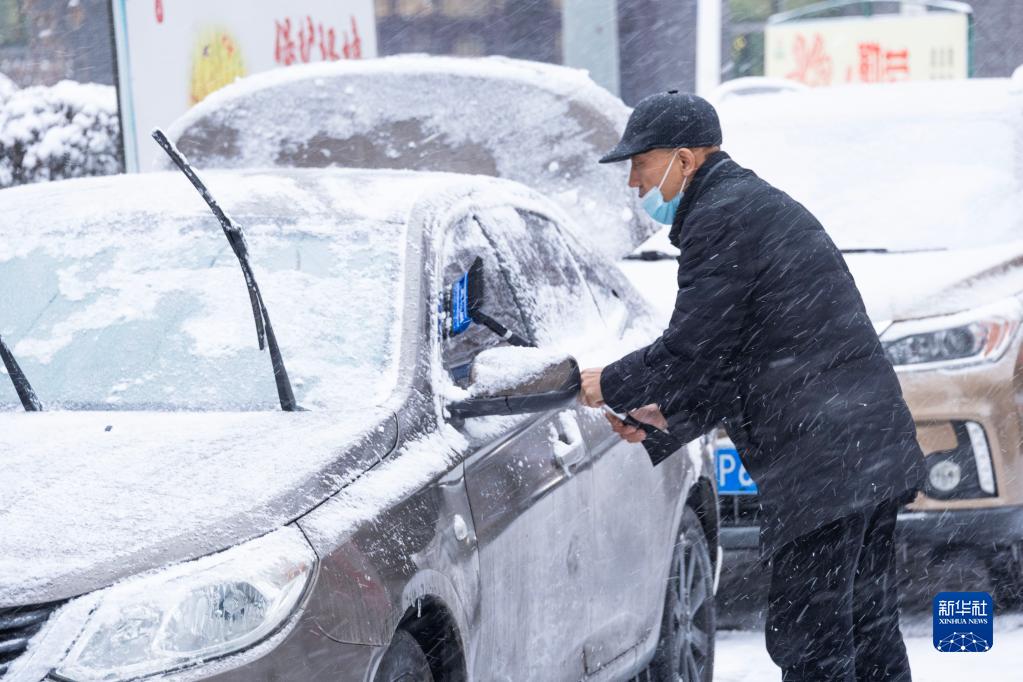 3月1日,在哈尔滨市香坊区,市民清扫车辆上的积雪。