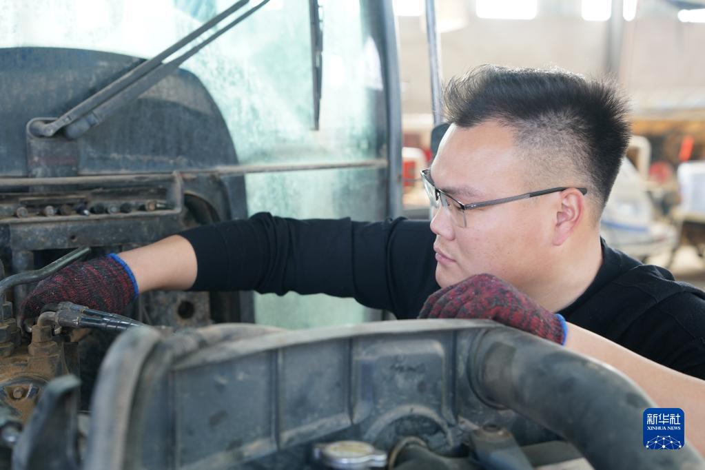 2月28日,王昌在来安县水口镇拥巷村对农业机械进行春耕前的检修。