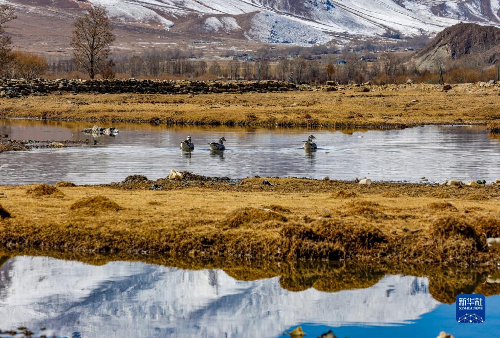 在拉萨市林周县的湿地里休憩的斑头雁(3月1日摄)。