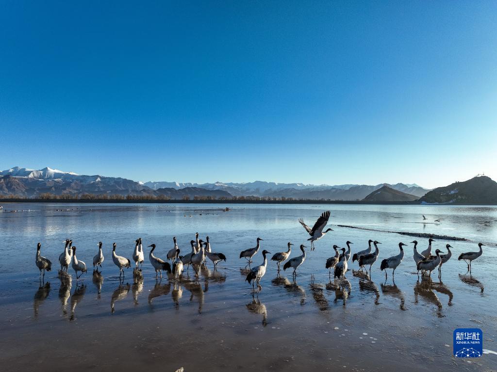拉萨市林周县卡孜水库拍摄的黑颈鹤(3月1日摄,无人机照片)。
