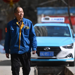强汉红从自己驾驶的出租车前走过(3月1日摄)。