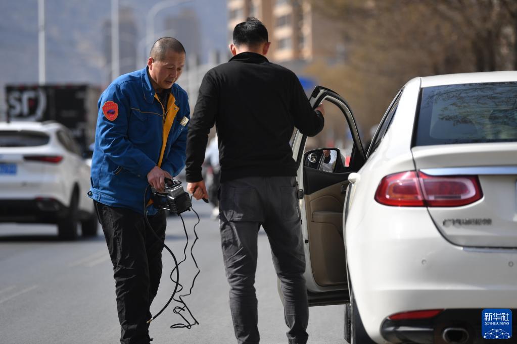 强汉红在路上帮助一名车主检查解决车辆轮胎故障(3月1日摄)。