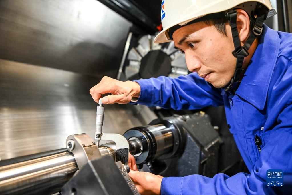 2月14日,在广西柳工机械股份有限公司的生产车间内,周颖峰对加工中的液压配件进行测量。