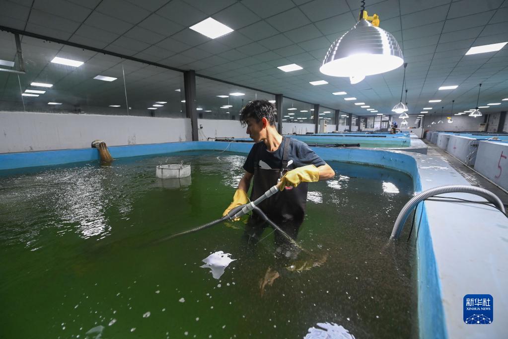 3月2日,在位于湖州市吴兴区东林镇保健村的湖旺水产基地的恒温繁育车间内,工作人员在进行人工吸污并查看水池中鲈鱼鱼苗的生长情况。该水产基地460亩育苗池塘配套着恒温设备,数字化繁育车间每日能孵化出2000万尾鱼苗,供给周边的渔业养殖户。