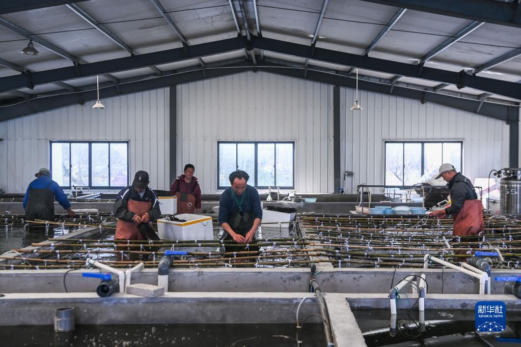 3月2日,在位于湖州市吴兴区东林镇保健村的湖旺水产基地孵化池内,工作人员将覆盖着鱼卵的棕片小心地放到水池里进行孵化。