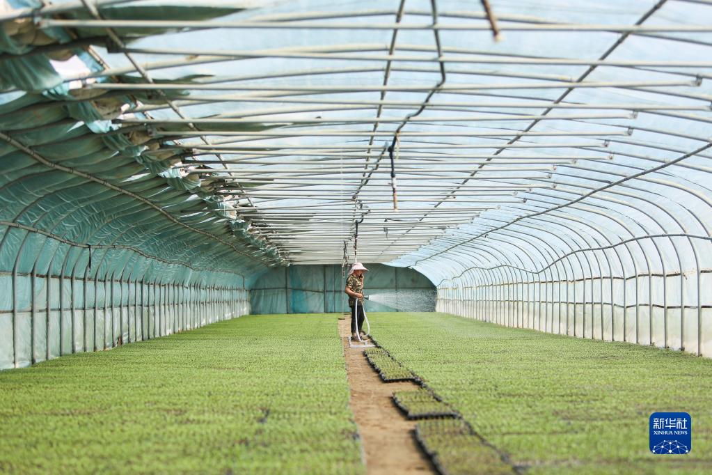 3月1日,村民在和田县塔瓦库勒乡辣椒产业园育苗大棚管护辣椒苗。