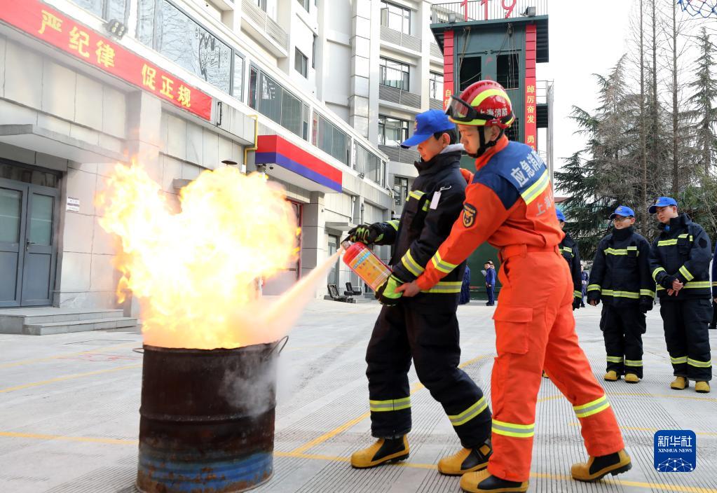 3月3日,在长宁消防救援支队训练场,消防员在辅助“小小消防志愿者”服务队队员进行灭火演练。
