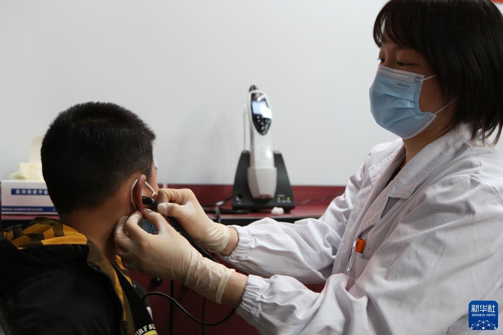3月3日,复旦大学附属儿科医院医生为儿童检查听力。