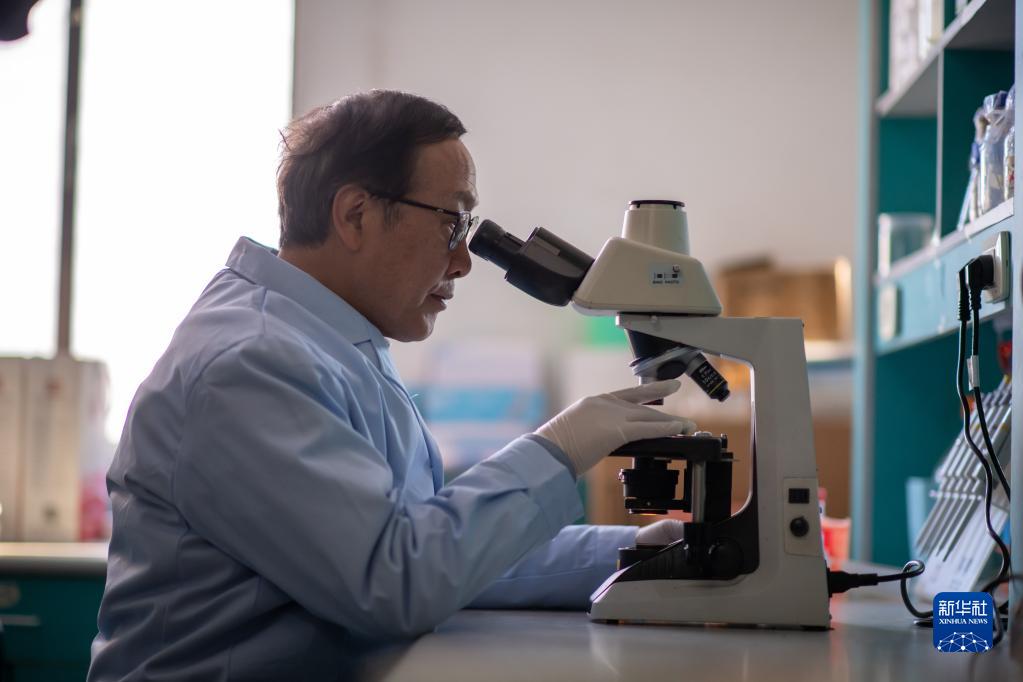 2月6日,全国人大代表、中国科学院院士、云南大学云南生物资源保护与利用国家重点实验室主任张克勤在实验室用显微镜观察线虫。