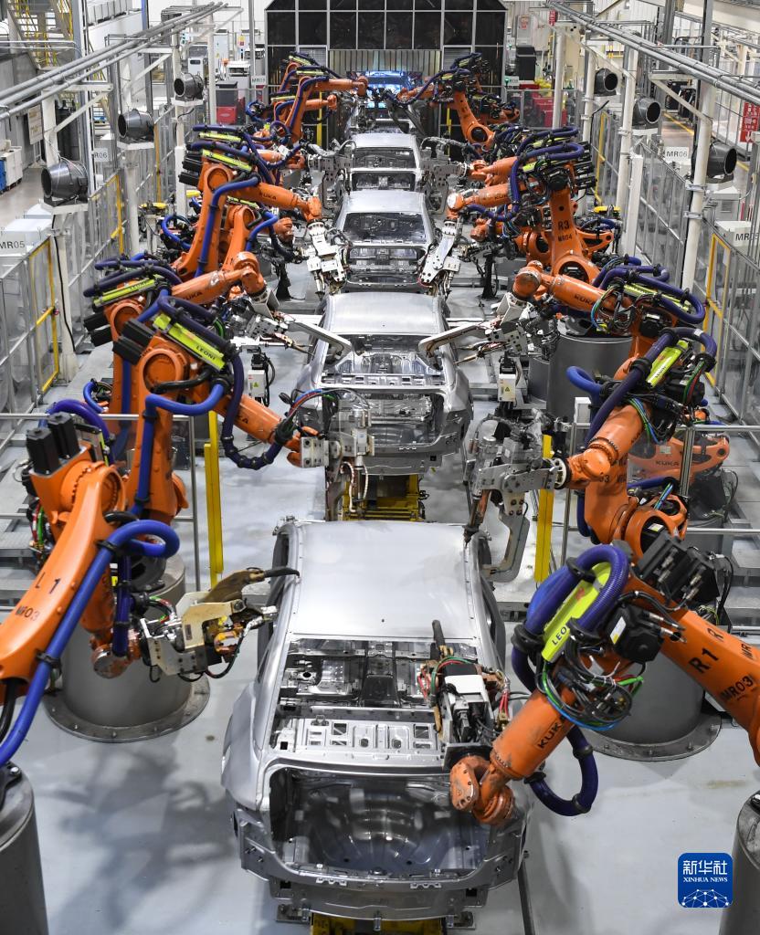 在广州市番禺区的广汽埃安新能源汽车股份有限公司焊装车间,机器人手臂在焊接作业中(2月24日摄)。