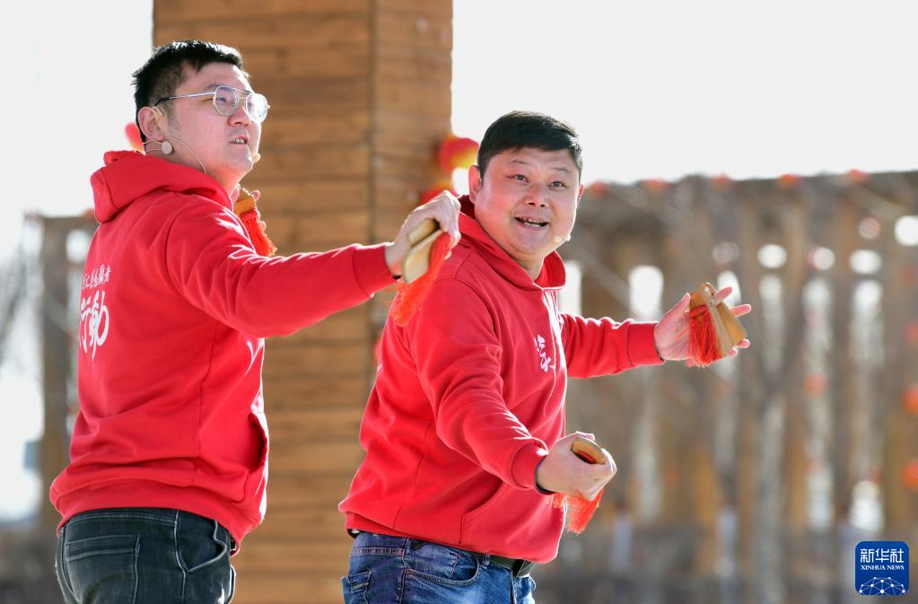 3月3日,在二连浩特市格日勒敖都苏木赛乌素嘎查文化广场,文艺志愿者为群众表演对口快板。