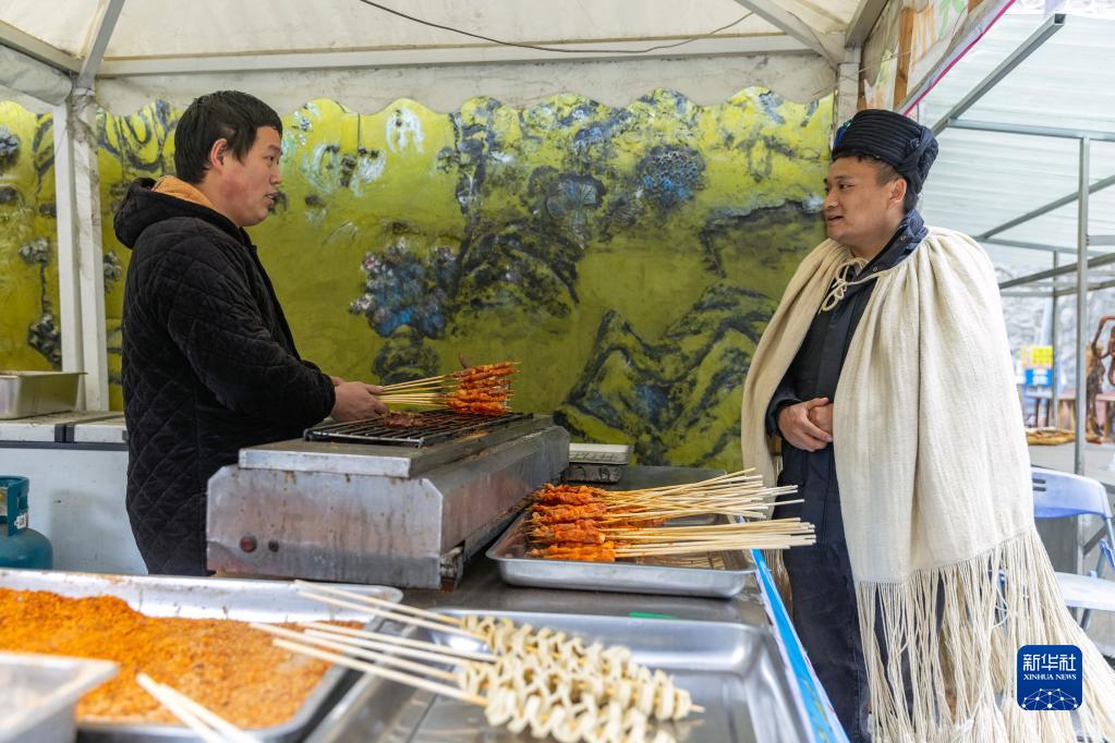 2月14日,郑望春(右)在古路村村口向村民了解烧烤小吃经营状况。