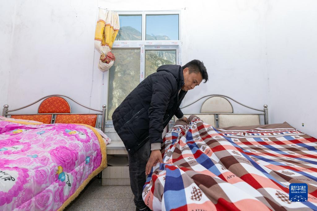 2月14日,郑望春在自家开办的农家乐“悬崖人家”的悬崖景观房里整理床铺。