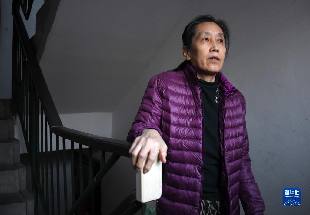 3月4日,在北京市顺义区旺泉街道宏城花园社区一座居民楼内,社区居民扶着修复好的扶手上楼。