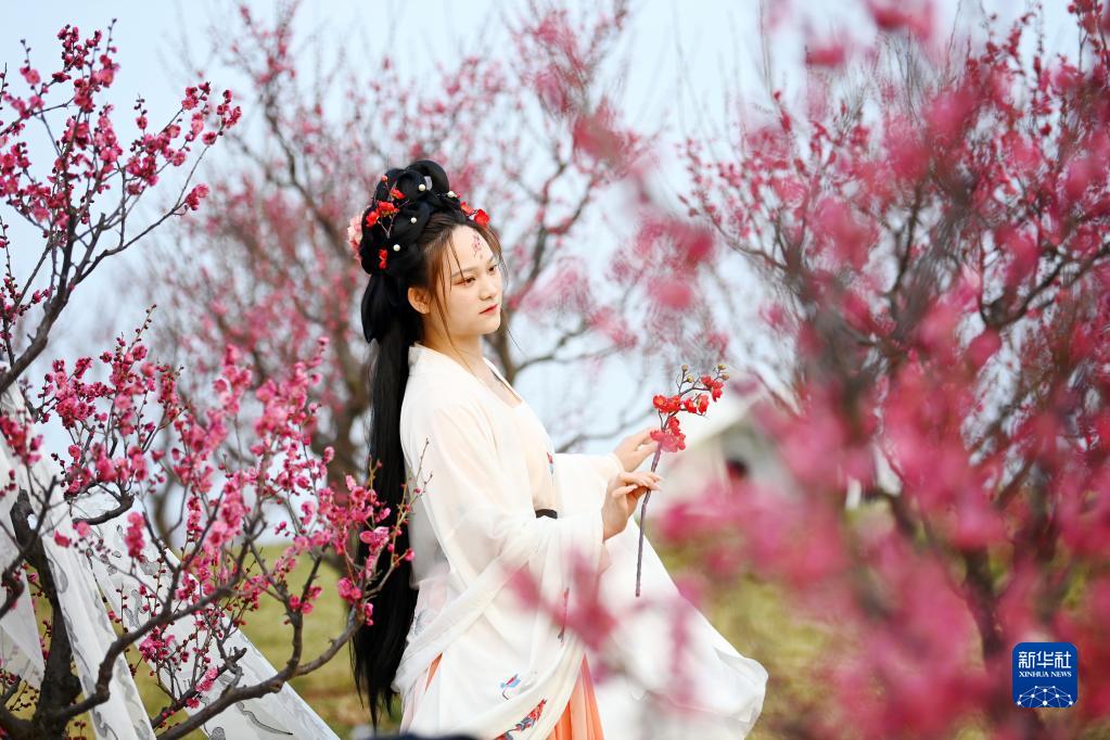 2月25日,古风爱好者在陕西省西安市秦岭终南山脚下长安唐村梅园内留影。
