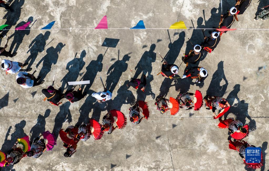 3月2日从空中俯瞰目瑙纵歌节现场(无人机照片)。当日,云南省德宏傣族景颇族自治州瑞丽市2023年目瑙纵歌节在位于中缅边境的勐秀乡户瓦山寨开幕。
