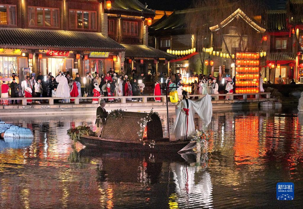 演员在河南省洛阳市洛邑古城内为游客表演(2月22日摄)。
