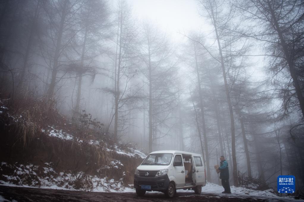 2月23日,由于道路积雪,陈祖章将邮车停在路边,步行上山送件。