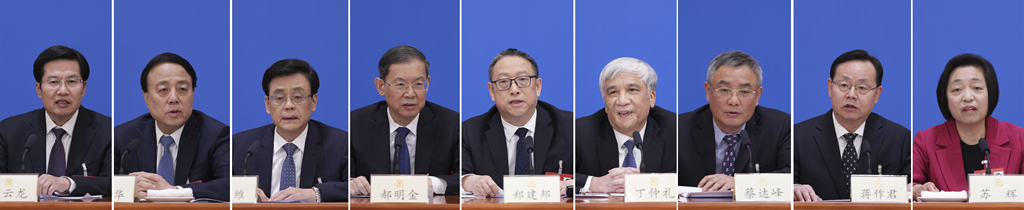 3月5日,全国政协十四届一次会议在北京人民大会堂举行民主党派中央和全国工商联领导人记者会。这是民革中央主席郑建邦(左五)、民盟中央主席丁仲礼(右四)、民建中央主席郝明金(左四)、民进中央主席蔡达峰(右三)、农工党中央主席何维(左三)、致公党中央主席蒋作君(右二)、九三学社中央主席武维华(左二)、台盟中央主席苏辉(右一)、全国工商联主席高云龙(左一)在记者会上(拼版照片)。