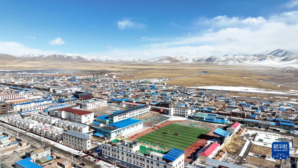 3月1日,在玉树州曲麻莱县,曲麻莱县第一完全小学学生在足球课上(无人机照片)。