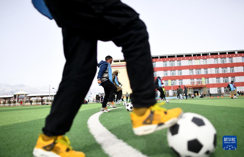 3月1日,在玉树州治多县,吉尕小学学生在足球训练课上。
