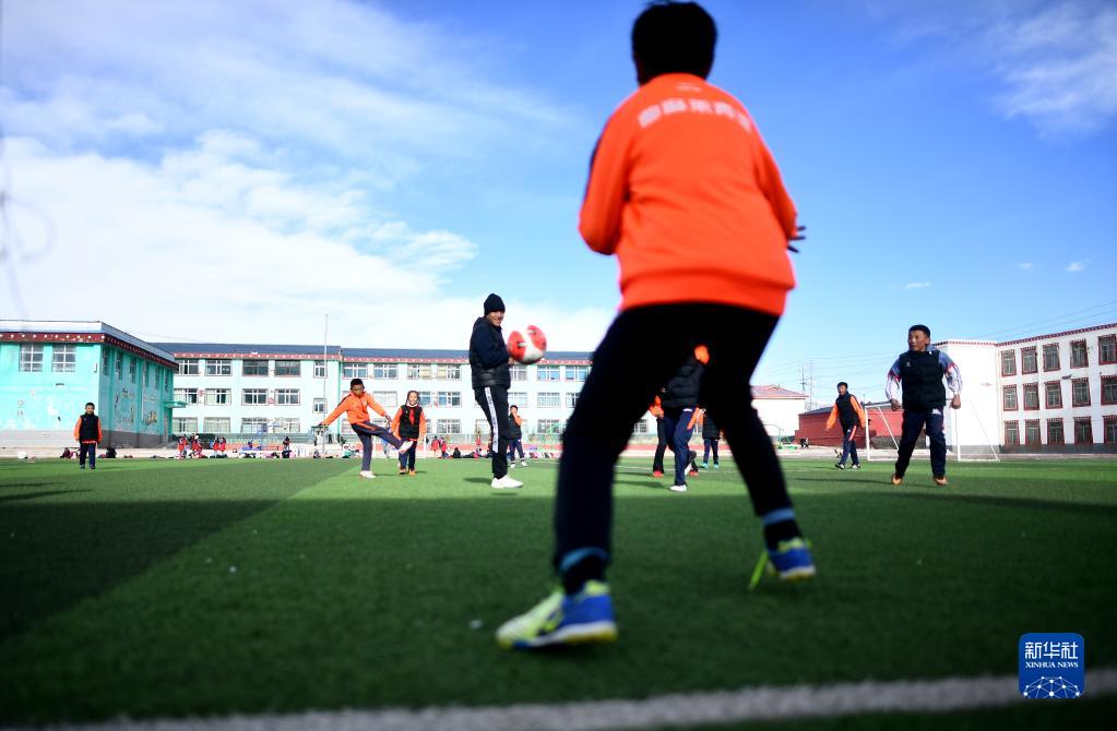 3月1日,在玉树州曲麻莱县第一完全小学,曲麻莱青训队球员在训练课上。