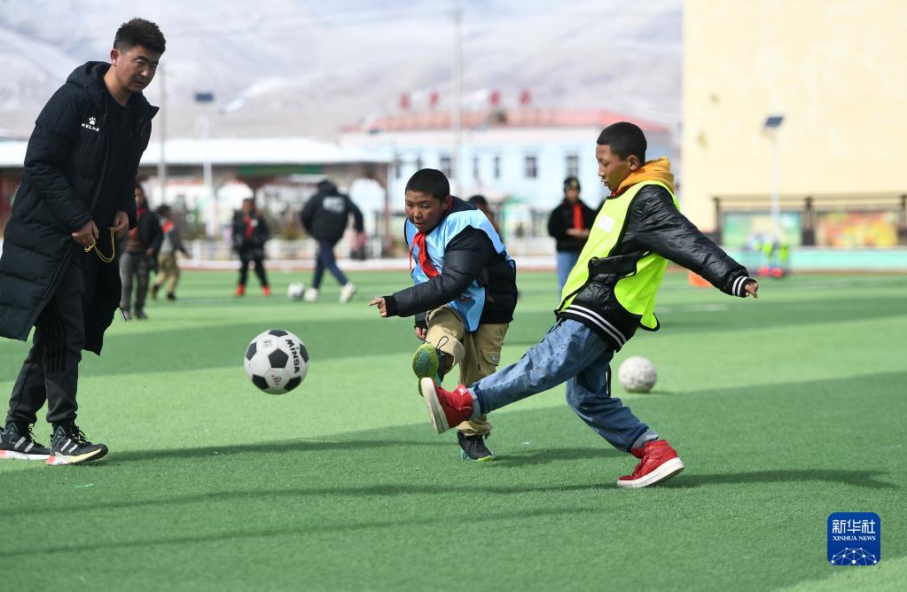 3月1日,在玉树州治多县,吉尕小学六年级学生罗松洋培(右二)在对抗训练中射门。
