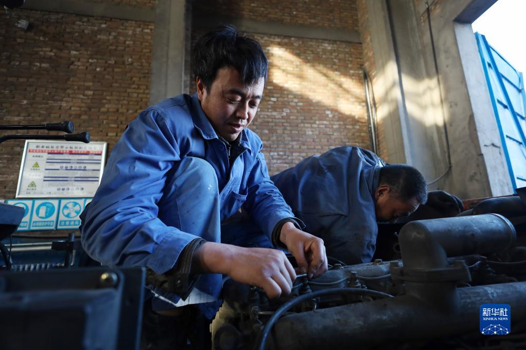 3月4日,刘富强(左)和同事在公司汽车维修车间维修车辆。