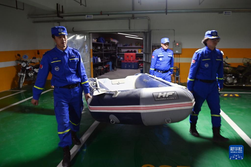 3月4日,刘富强(左一)在嘉峪关蓝天救援队装备库搬运救援装备冲锋舟。