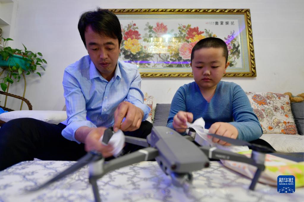 3月4日,刘富强(左)在家中和儿子一起保养救援装备无人机。