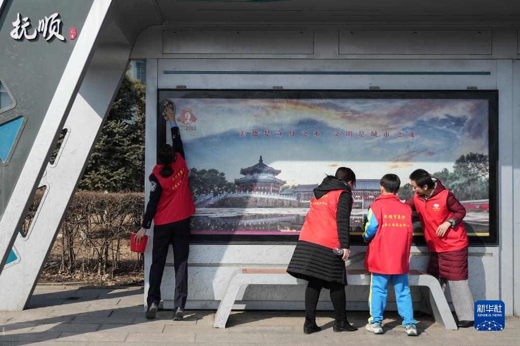 3月4日,“百姓雷锋”团队抚顺市聚沙社会工作服务中心的志愿者在清洁公交车站。