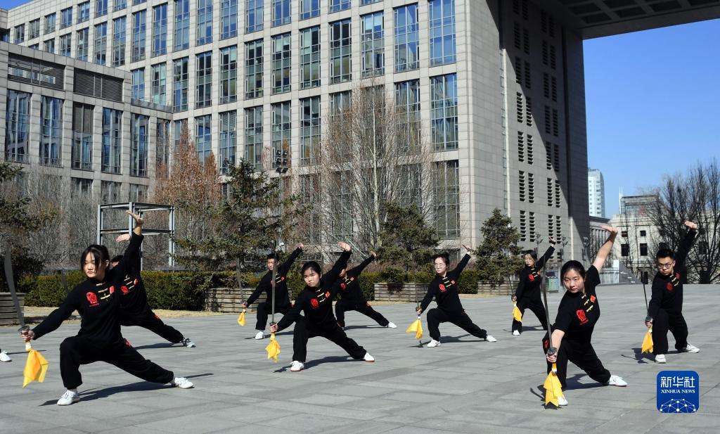 3月2日,在北京航空航天大学,武术队的队员在校园内进行刀术训练。