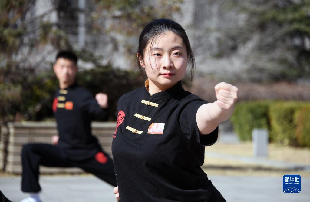 3月2日,在北京航空航天大学,武术队的队员在校园内进行长拳训练。
