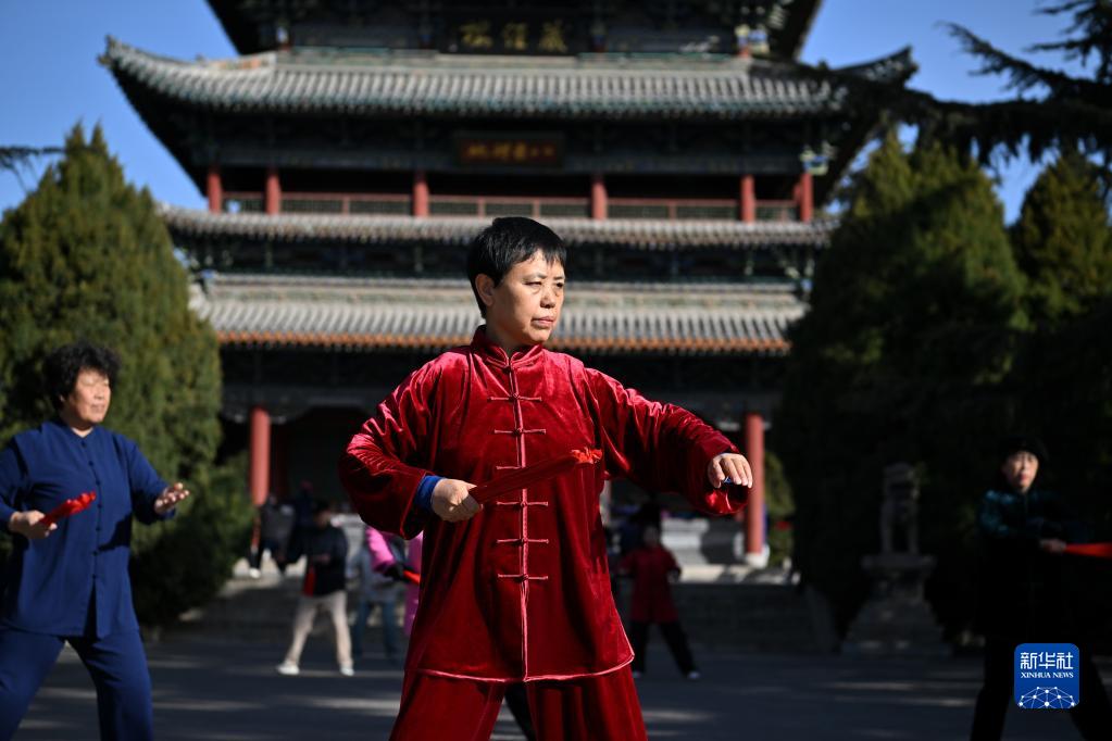 3月1日,在太原市迎泽区迎泽公园,市民在练习太极扇。