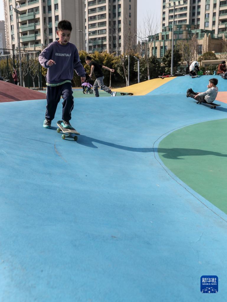 3月4日,孩子们在江苏省昆山市周市镇城市运动广场上运动。