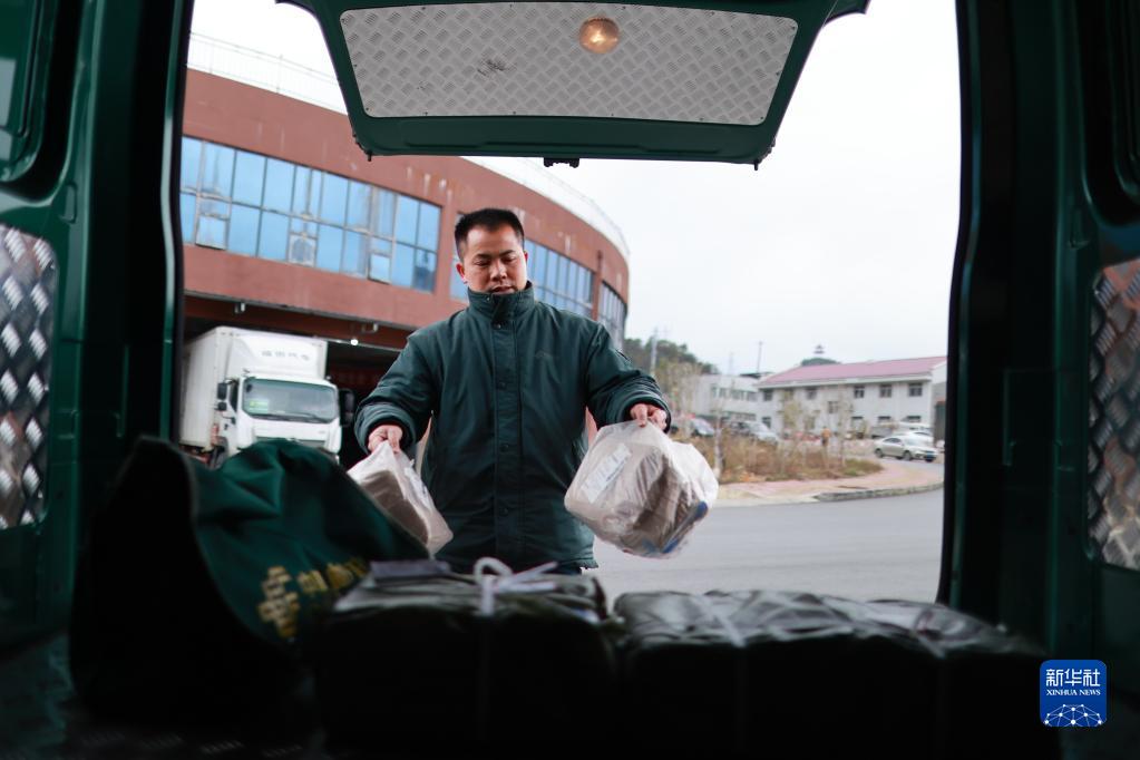 在贵州省龙里县草原路邮政邮件处理中心外,莫富元将当天需要投递的物品拿上小货车(2月14日摄)。