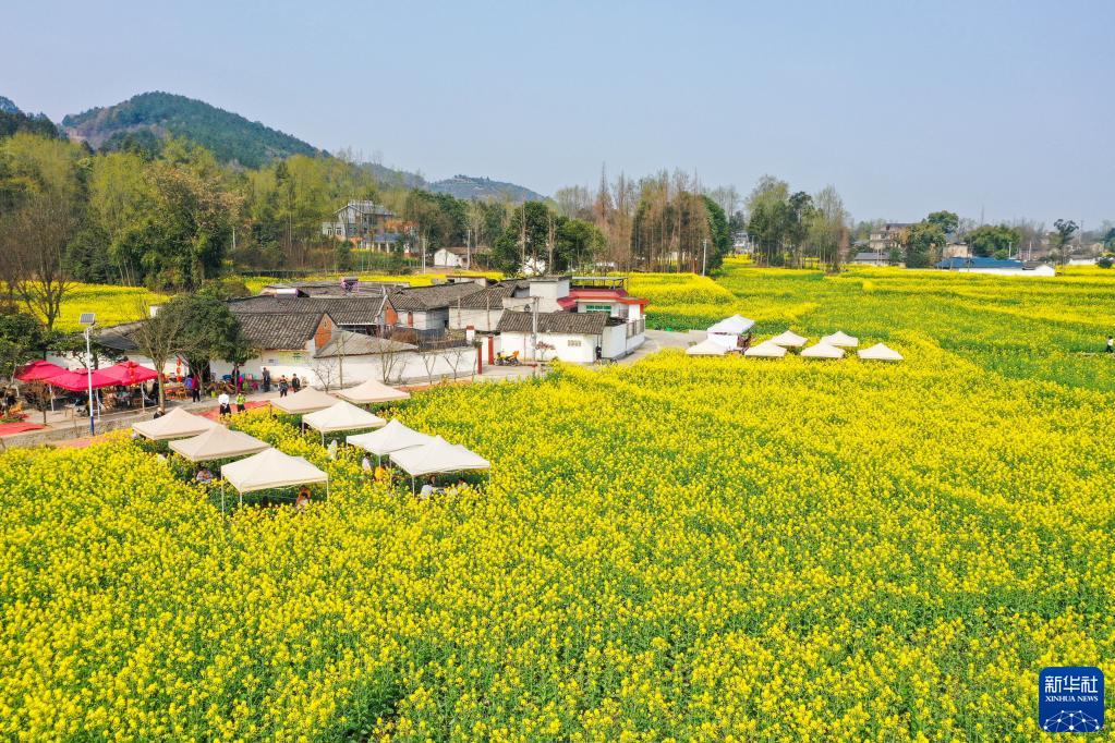 近日,位于四川成都崇州市的数万亩油菜花竞相绽放,吸引游客前来踏春观光。