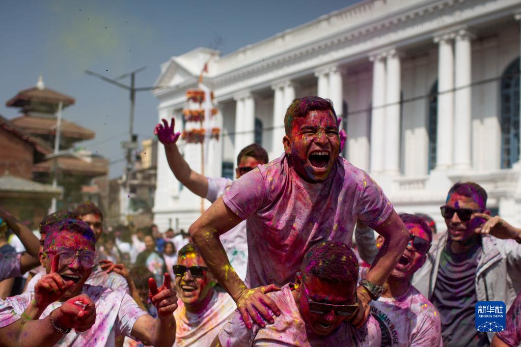 3月6日,人们在尼泊尔加德满都参加洒红节庆祝活动。