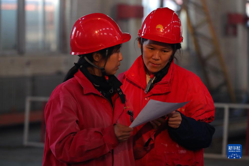 2月27日,王喜莲(左)和骆建宁在焊接车间研究图纸。