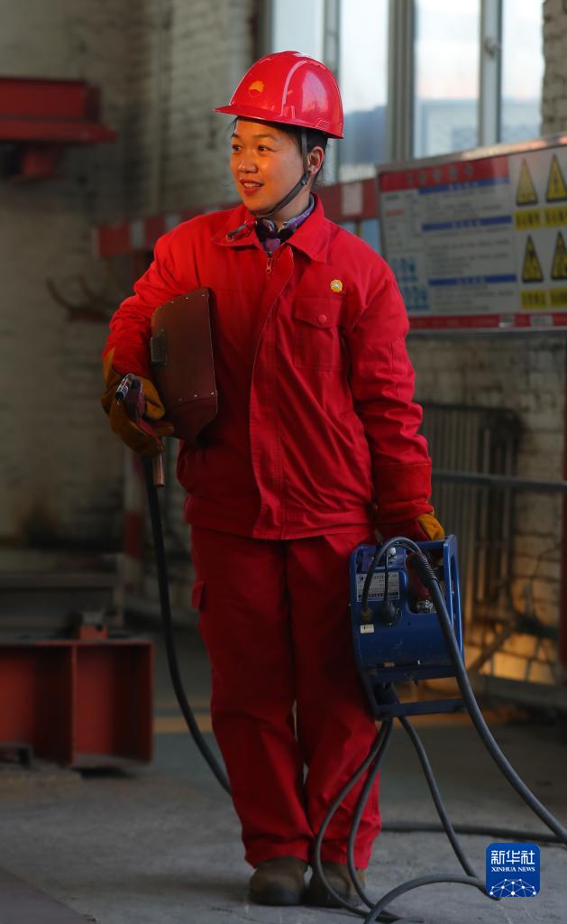 2月27日,李文静在焊接车间拿起焊枪准备工作。