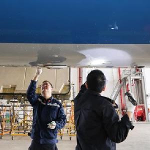 3月7日,在海口美兰国际机场,南航机务人员对“消博号”彩绘飞机进行深度检查。
