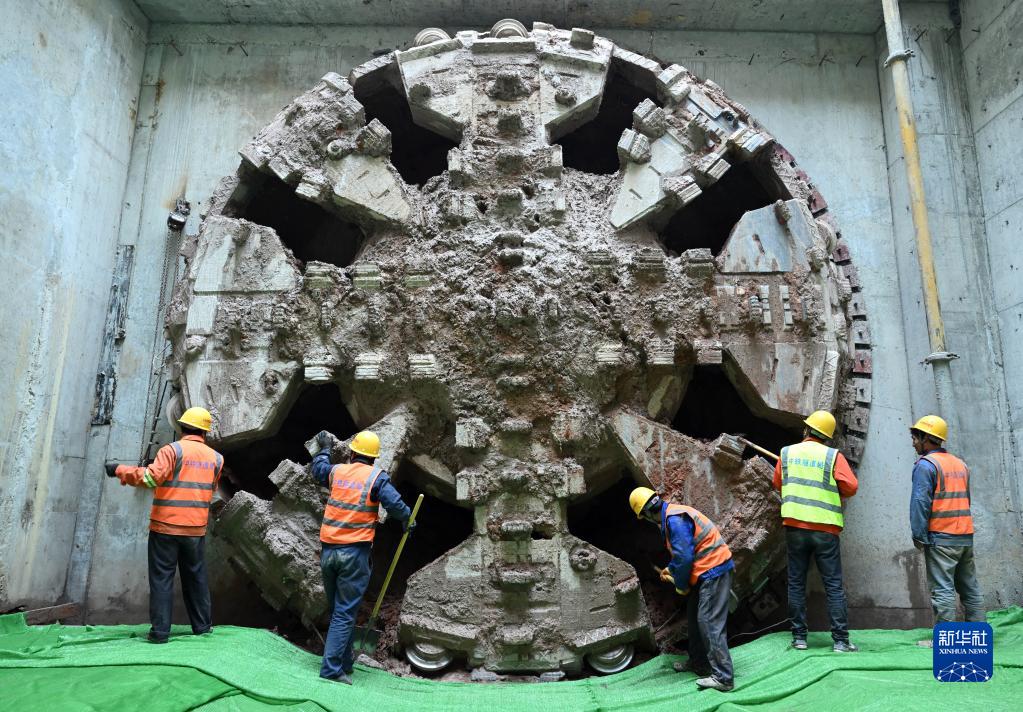 3月7日,在合肥轨道交通4号线南延线万佛山路站至明珠大道站区间中间风井,工作人员对破洞而出的盾构机进行清理。