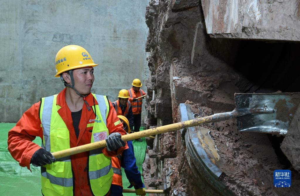 3月7日,在合肥轨道交通4号线南延线万佛山路站至明珠大道站区间中间风井,工作人员对破洞而出的盾构机进行清理。