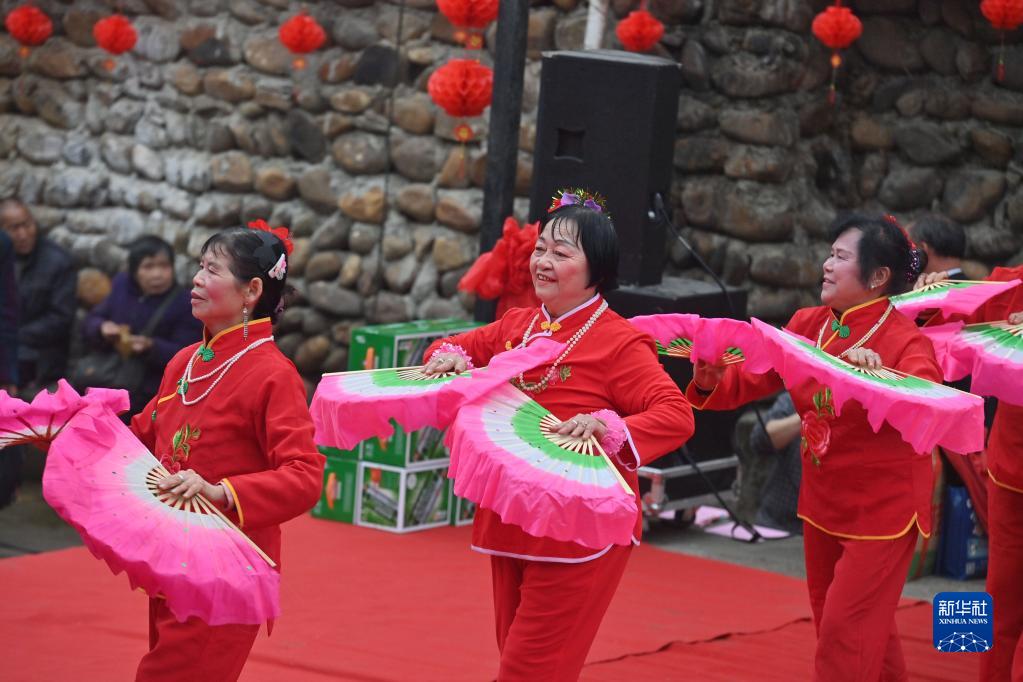 3月7日是广西柳州市融安县大将镇龙妙村农历二月十六传统会期,龙妙村的妇女在表演地方特色的剧种“彩调”。