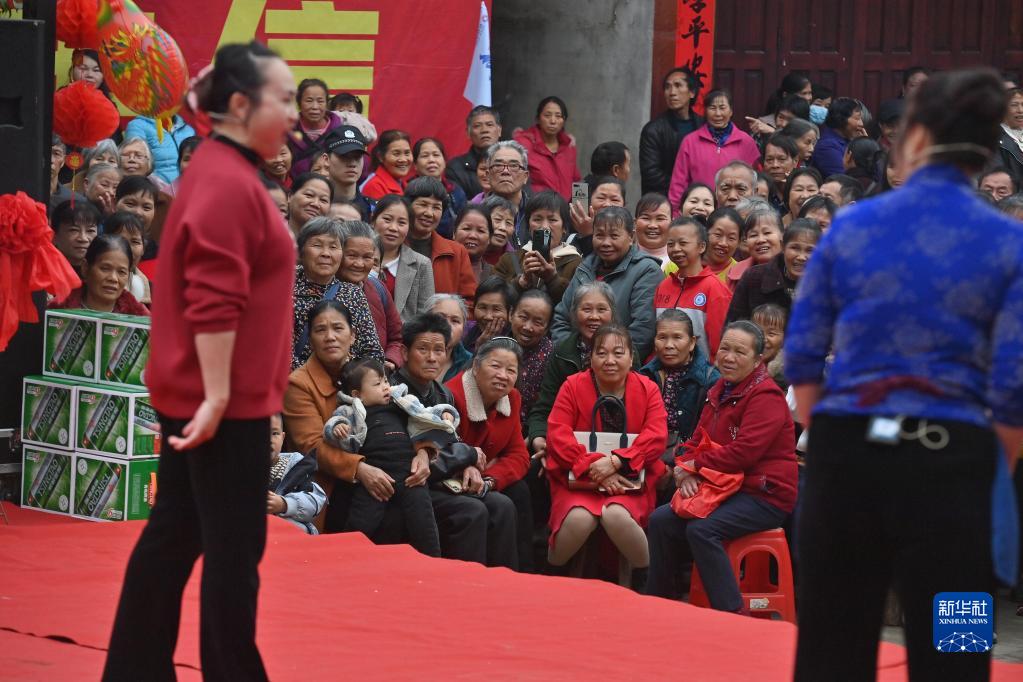 3月7日是广西柳州市融安县大将镇龙妙村农历二月十六传统会期,龙妙村的妇女在观看民俗表演。
