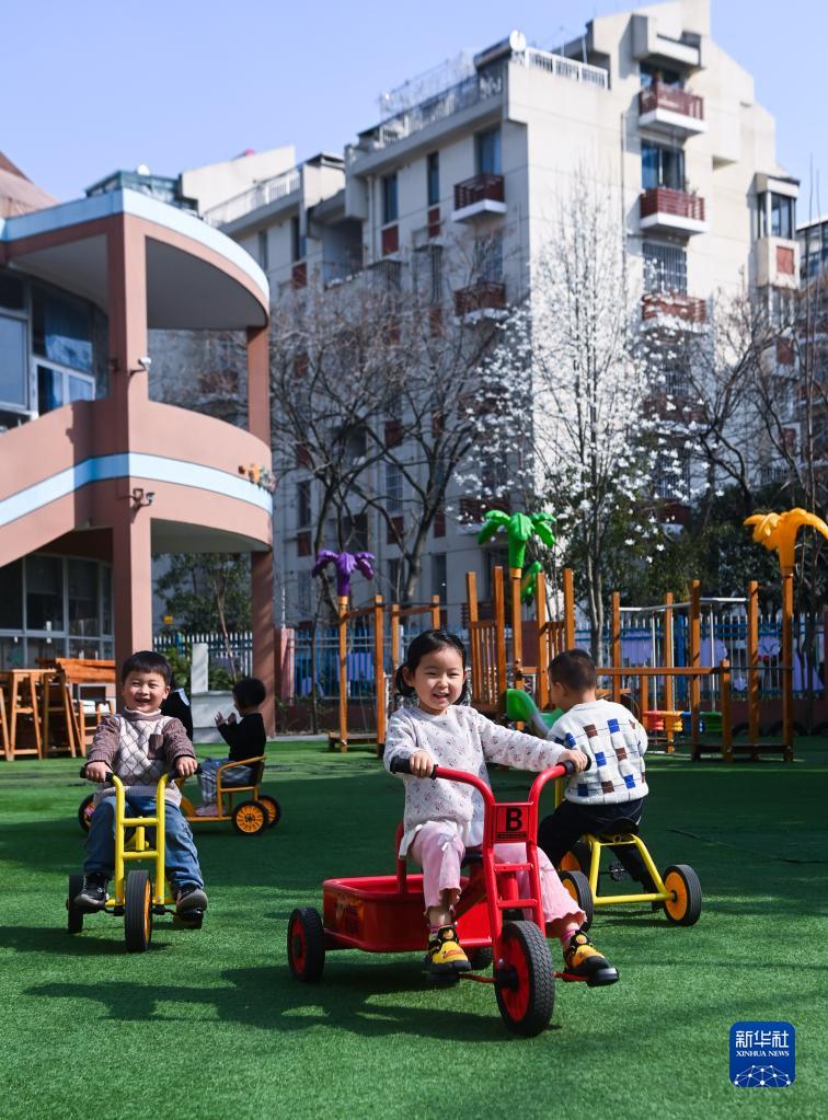 3月7日,在嘉兴市南湖区桂苑社区的桂苑幼儿园内,孩子们在操场上玩游戏。