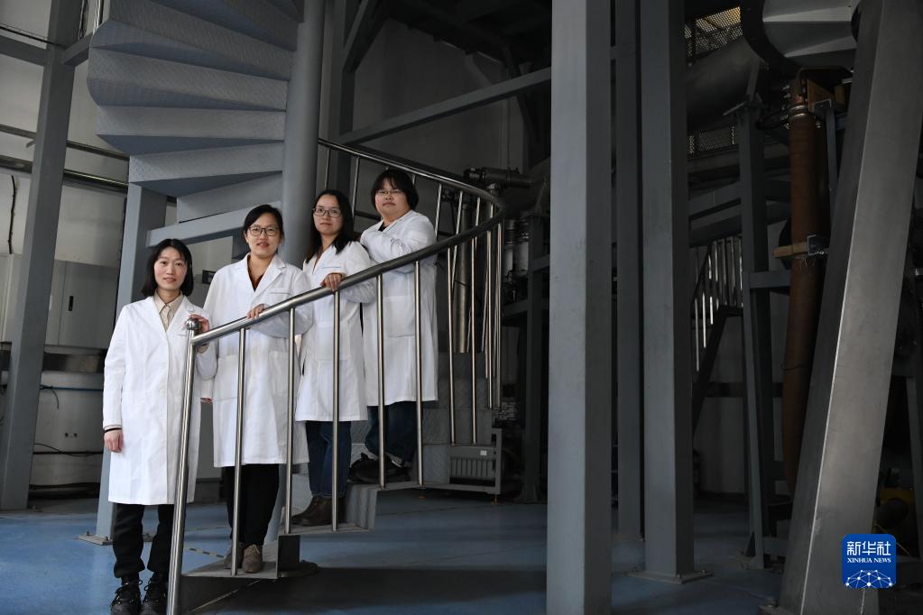 3月3日,中科院合肥物质科学研究院强磁场科学中心高级工程师唐佳丽(右二)与同事在稳态强磁场实验装置旁合影。