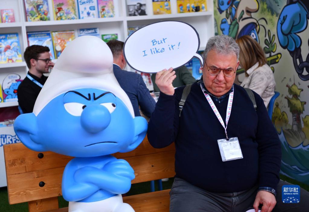 3月7日,参观者在意大利博洛尼亚国际儿童书展上与卡通玩偶合影。