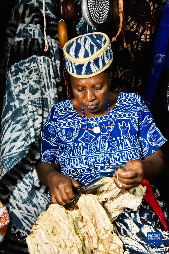 恩多普是主要流行于喀麦隆西部大区的一种布料,可以制成衣物、帽子和项链等。制作过程中,先用墨线在白色棉布上绘制纹样,再用干燥的棕榈叶脉做线把纹样扎起来,经靛蓝的植物染料浸染后,拆去棕榈叶脉,便得到蓝底白纹的恩多普。如今,众多喀麦隆妇女投入恩多普制作领域,这不仅改善了她们的生活,也推动了文化的传承。