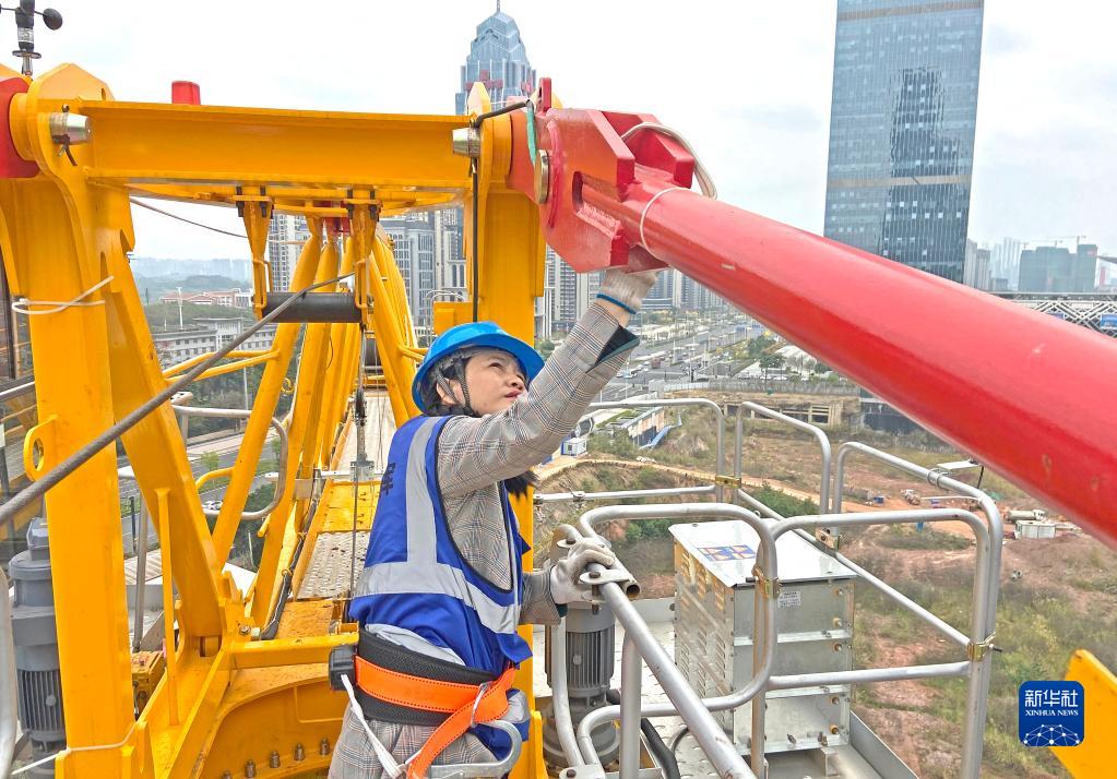 3月7日,在广西南宁市良庆区五象大道中建三局一公司南宁中银金融中心项目建设工地,覃桂英在检查塔吊。